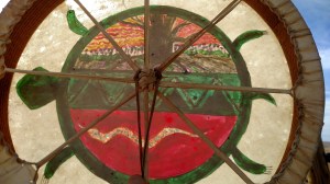 The summer before the most recent May, in the apple orchard on the outside perimeter of our campfire circle, I built with the help of friends a tee-pee made with twelve freshly cut bamboo poles (leaves still on the stalk) measuring 20 feet in length. Together we raised it into place. I never covered the frame, preferring the synchronous sense of shelter and open-air. One night while camping inside, tucked into my sleeping bag, looking up at the stars, I knew in my heart, I even vowed, I would make my own drum to play inside my own, this very teepee.