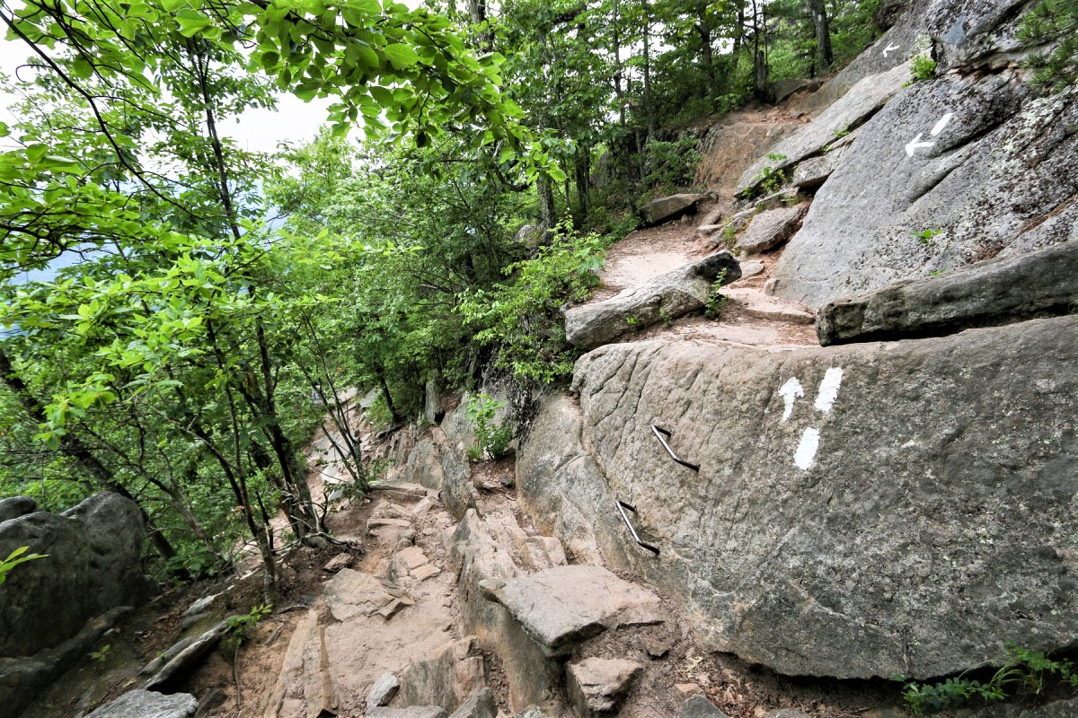 Sweat ran in rivulets down my back. At one point on the trail, a white blaze arrow pointed straight up. I took a deep breath, grabbed hold of an iron rung, and another, got beyond the rock face, squeezed between a pair of trees lining the path, too narrow to go forward with my pack, so sideways I inched through this challenging trail. It was emotionally and physically exhausting, and I wanted to be done with it!